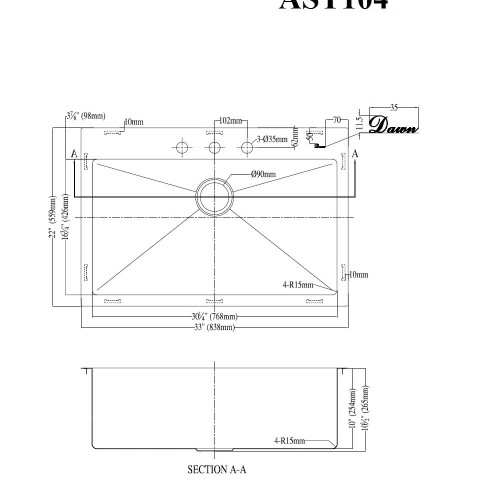 Dawn Top Mount Single Bowl Sink with Three Pre-cut Faucet Holes