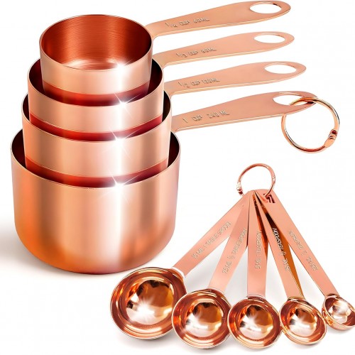 Measuring Cups and Spoons Set of 9, Utensils for Dry and Liquid Ingredients, Copper Kitchen Accessories, Rose Copper Decor for Home, Stackable, Sturdy Stainless Steel