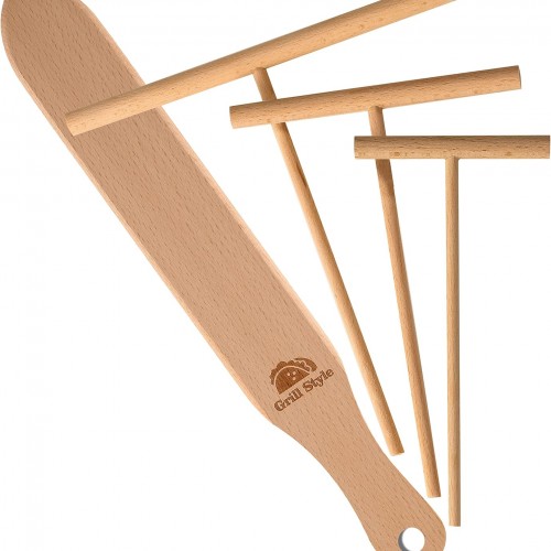 Crepe Spreader and Spatula Kit, 3.5 Inch, 5 Inch, 7 Inch T-Shaped Batter Spreaders & 13.4 Inch Spatula Turner, Pancake Tool, Natural Wood Material Crepes Sticks Fit Any Crepe Pan Maker, Pack of 4