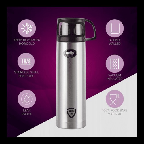 Cello Stainless Steel Flask With Cup & Jacket ( Instyle Vaccum Insulated, 1Litre, Black)