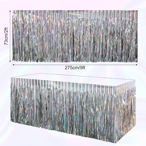 2 Pack Iridescent Table Skirt, Metallic Foil Fringe Tinsel Table Skirts for Rectangle Tables, Disposable Laser Rainbow Table Skirt Iridescent Party Decorations for Birthday Wedding Holiday, 29x108Inch