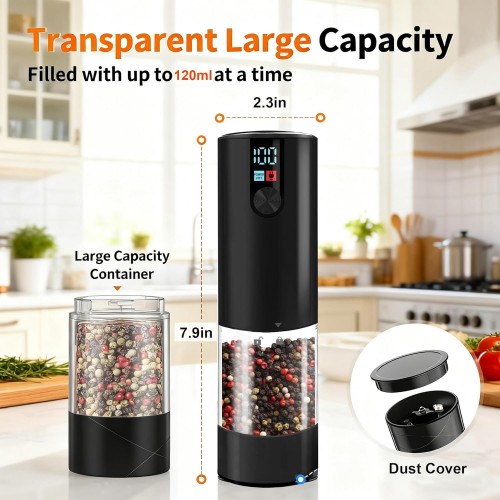Fresh World 2Pack Electric Salt and Pepper Grinder Set Rechargeable with LED Light, Adjustable Coarseness Large Capacity Automatic Salt Pepper Mill Grinder for Kitchen, Restaurant, Outdoor, Black