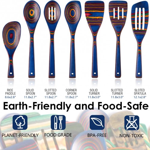 Kitchen Pakkawood Wooden Spoons for Cooking – 7-Piece Kitchen Utensil Set with Spatula, Corner Spoon, Rice Paddle – Nonstick Safe Durable Wooden Cooking Tools for Home Kitchen (Spectrum) by Howhong