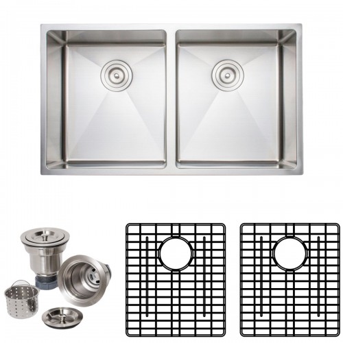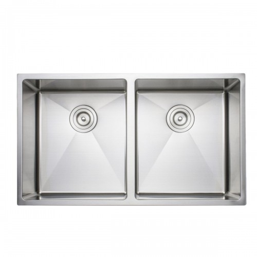 Wells Sinkware Handcrafted 33″ 16-Gauge Undermount 50-50 Double Bowl Stainless Steel Kitchen Sink