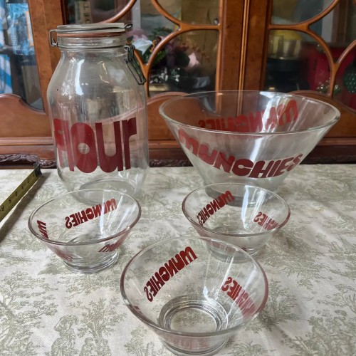 Up for consideration is a beautiful vintage set of red font munchies bowls and flour jar. This set would look lovely in your home on display or in use. This is also a great find for the interior design enthusiast. Please check out my other listings!