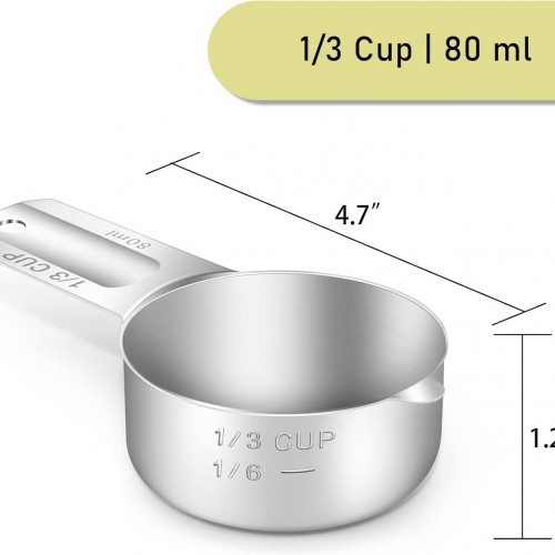 - 【Clear Marking】The handle is engraved with the metric and US marking (80ml | 1/3 CUP) and will not wear out with further use. The cup also has an embossed marking, so you can measure 1/6 cup of liquid or powder