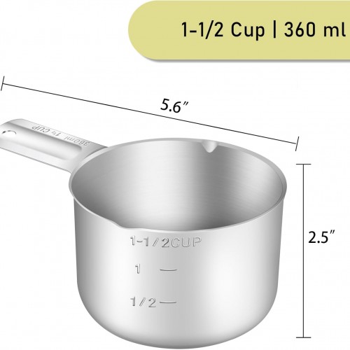 2PCS 1-1/2Cup (360ml, 12oz) Single Measuring Cup, Stainless Steel Measure Scoop, Metric and US Measurement, Dishwasher Safe