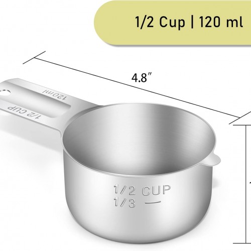 - 【Clear Marking】The handle is engraved with the metric and US marking (120 ml | 1/2 CUP) and will not wear out with further use. The cup also has an embossed marking, so you can measure 1/3 cup of liquid or powder