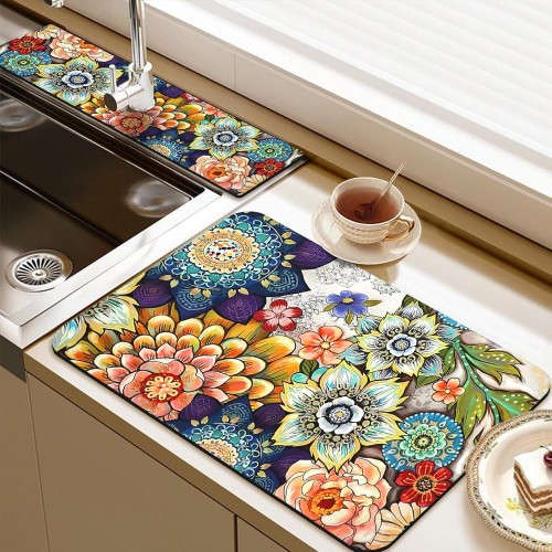 2Pcs Dish Drying Mats Faucet Mats Sets Large Size Coffee Mats Sink Faucet Mat Splash Guard for Kitchen Counter Bathroom Sink Coffee Bar Kitchen Decor (Retro Boho, 18″x24″ 15″ x 5.5″Set)