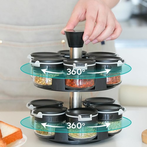 - ● Modetn 360 Rotating Spice Rack: The seasoning organizer has smooth feeling 360 degree spinning stainless steel rack for easy and flexible navigation. This high quality sturdy revolving rack organizer is stable and holds jars tightly keeping them from falling. It makes it easier to store the spice jars and keep them tidy which provides a great cooking experience.