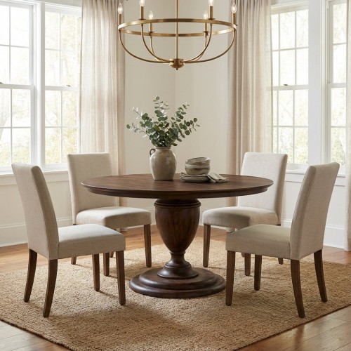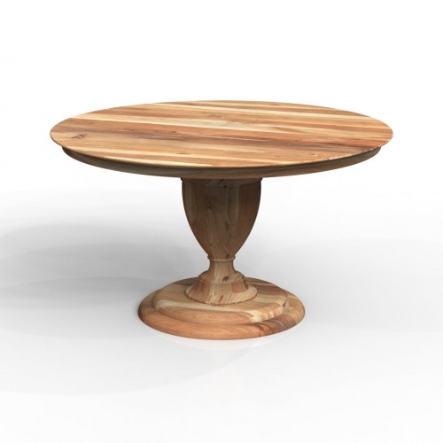 Manufactured from solid acacia hardwood. Utilizes hand-carved, solid acacia wood pedestal base for beauty & space efficiency.