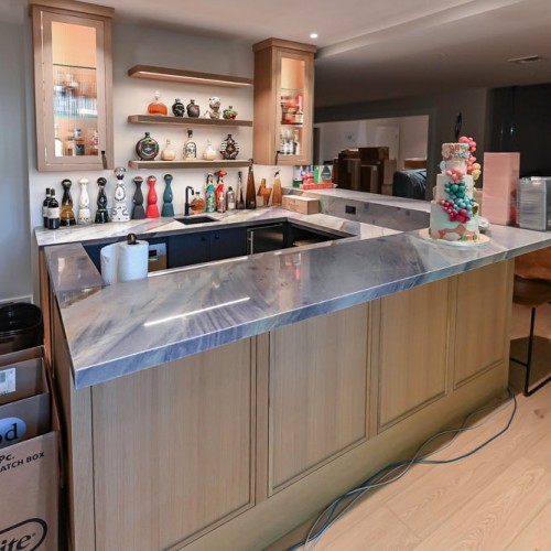 Custom Transitional Black Wet Bar with White Marble Countertops