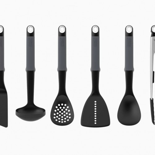 - Set includes: solid spoon, stainless steel tongs, slotted turner, flexible turner, ladle and slotted spoon