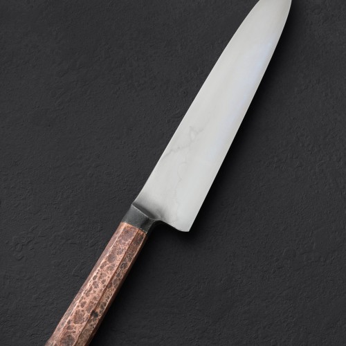 With 275mm, or nearly 11″ of hand forged, house-made ladder pattern carbon damascus steel, inlaid at the bolster with fine silver and 24k gold, comes the latest one-of-a-kind chef knife handmade in Brazil by artist and bladesmith William Porto. Thin, precise, and refined from tip to heel, the 58mm tall blade offers lateral flexibility throughout its length, supported by a slim, tapering spine which culminates at a fine, needle-like tip ideal for detail and slicing work. The beautiful, handmade damascus displays a classic ladder pattern, etched, and superbly finished with convex bevel geometry that balances strength and finesse for all manner of daily kitchen work, especially those tasks requiring a hard, razor-sharp, laser-like edge. Above a rounded, curved, and comfortable blade heel, William has inlaid the sculpted bolster with a stunning combination of 1000 pure silver and gold, marrying elegantly with the Arizona Desert Ironwood’s classic look and museum fit where wood meets steel. For transport and protection, a custom leather saya with turned and detailed ironwood pin is included.