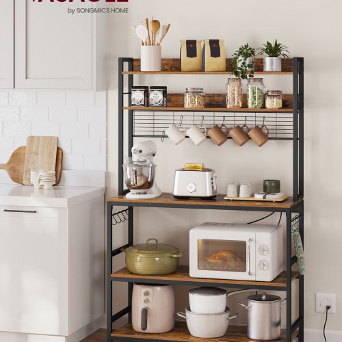 VASAGLE Hutch Bakers Rack with Power Outlet, 14 Hooks Microwave Stand, Adjustable Coffee Bar with Metal Wire Panel, Kitchen Storage Shelf, 15.7 x 39.4 x 66.9 Inches