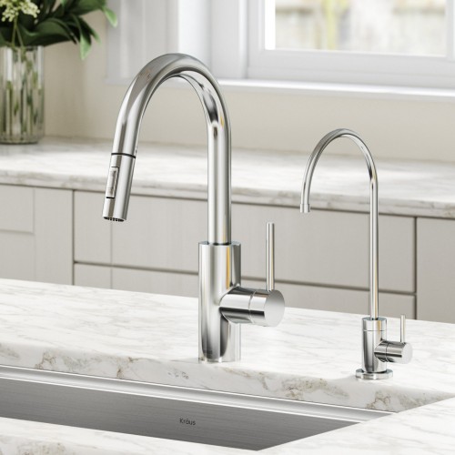 - PERFECT MATCH: Create clean contemporary style and redefine the functionality of your kitchen with a streamlined pull-down faucet and coordinating water filter faucet