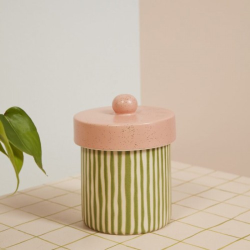 Reminiscent of a watermelon with its playful striped pattern & energizing hues, the food-safe Margot Canister lifts up the room with color. This ceramic container features hand painted irregular green stripes that contrasts nicely with the speckled coral pink lid with a ball handle. With a sealed interior, this versatile canister can be used for storing food, plant accessories, & more. Pair with the Melancia Pots for a bright, coordinated look. Dimensions: 5.75″ x 5.75″ x 7.25″