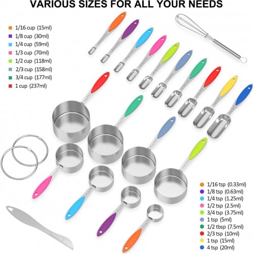 - SET OF 20: This package includes 8 Measuring Cups (1/16 cup, 1/8 cup, 1/4 cup, 1/3 cup, 1/2 cup, 2/3 cup, 3/4 cup, 1 cup), 10 Measuring Spoons (1/16 tsp, 1/8 tsp, 1/4 tsp, 1/2 tsp, 3/4 tsp, 1 tsp, 1/2 tbsp, 2/3 tbsp, 1 tbsp, 4 tsp), 1 Leveler & 1 Mini Whisk, colored handles and various sizes meet all your needs on baking