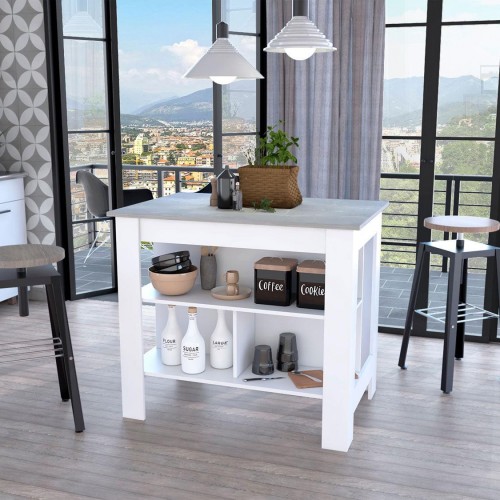 Add more counter space and storage to your kitchen with this incredible Modern White and Light Oak Kitchen Island. The three storage shelves are perfect for holding essential cooking items like pots, pans, spices, utensils and even kitchen towels, allowing you a stress-free kitchen environment where you can cook to your heart’s content without the worry of clutter and the lack of countertop space! The sturdy structure has spacious leg room underneath, giving you the option to prep your meals while sitting on a stool. at the island. The wide counter top is a sturdy surface that is perfect for all your meal prepping desires and needs! 35.4″ x 40.5″ x 27.5″