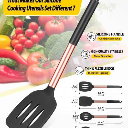 Pack of 4 Silicone Cooking Utensils Set, Non Stick Large Solid Spatulas, Heat Resistant Rose Gold Black Slotted Spoons, Ideal BPA Free Kitchen Turners for Frying, Mixing,Serving,Draining,Turning