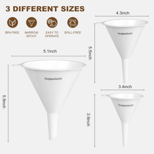 - 【You Will Receive】: We will provide you with three different sizes of DolphinSmile funnel set: small funnel 4.4 x 3.3 in; medium funnel 5.5 x 4.4 in; large kitchen funnel 5.8 x 5.2 in. Regardless of the size of the container, these three funnel can be accurately matched to meet diverse needs and avoid spills or waste.