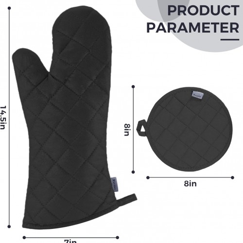 Set of 4 Oven Mitts and Pot Holder Heavy and Tall Kitchen Cotton Gloves Lined Towelcloth, Gloves Length 40cm, Pot Holder Width 20cm Diameter Round… (Black)