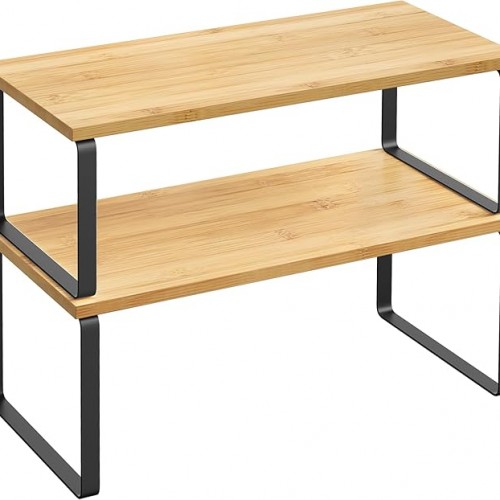 SONGMICS Cabinet Organizer Shelf, Set of 2 Kitchen Counter Shelves, Kitchen Storage, Spice Rack, Stackable, Expandable, Metal and Engineered Wood, Ink Black and Natural Beige UKCS200B01