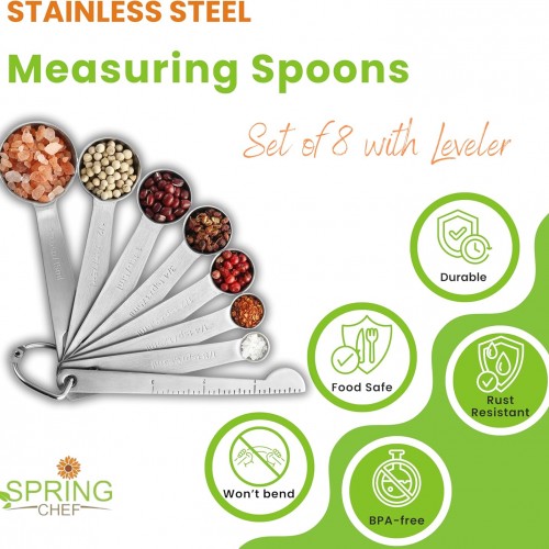- Time-Saving and Compact – With their easy-to-fill round design, these stainless measuring spoons for measuring dry and liquid ingredients fit easily inside narrow spice jars. This kitchen measuring set is also held together by a detachable ring, so you can use and organize them without hassles.