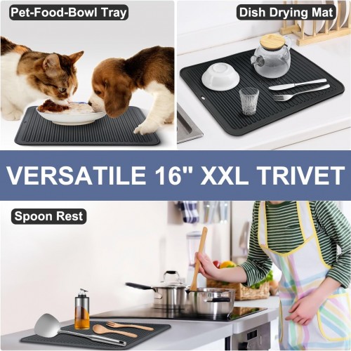 - MULTI-FUNCTIONAL: As the trivets for hot dishes are non-slip, flexible and soft, not only suitable for large cookware such as air fryers, coffee makers, but also can be used as pot holder, dish drying mats, spoon rest, pet bowl tray, pot mat and more. Folded up silicone pot holders are also perfect for use in the oven, microwave or refrigerator to protect your hands from hot and cold