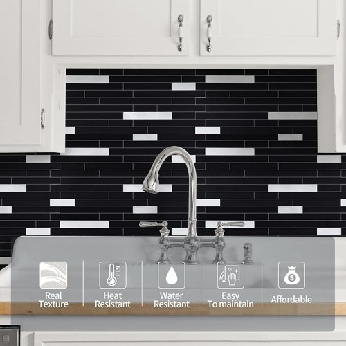 Yipscazo 10 Sheets Peel and Stick Stone Metal Tile Backsplash, Stick on Tiles for Backsplash Kitchen, Bathroom, Laundry Room, Camper, Fireplace (12” X 12”, Polished Pure Black)